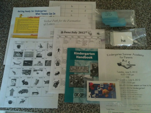 I can’t say that the parents had as much fun. There weren’t any art projects. We weren’t allowed to eat the snack. We watched videos on how to properly drive through the “kiss and ride” lane and why backpacks on wheels are destroying civilization. Then, we were told to quit our day jobs so that we could spend the summer doing skill and drill in hopes of possibly preparing our kindergartners for the first day. Piper is supposed to be reading at Level Four by the first day, whatever that means. Here is some of our summer homework: