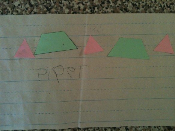 The kids were taken to do “fun” activities, which looked a little like “testing” to me. Piper aced the name writing and pattern part.