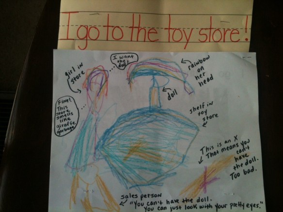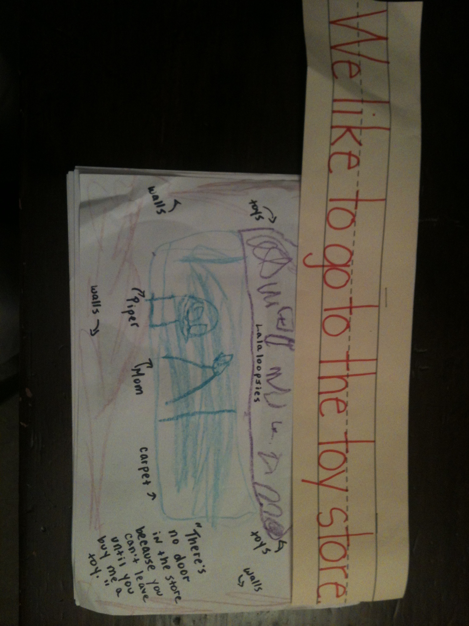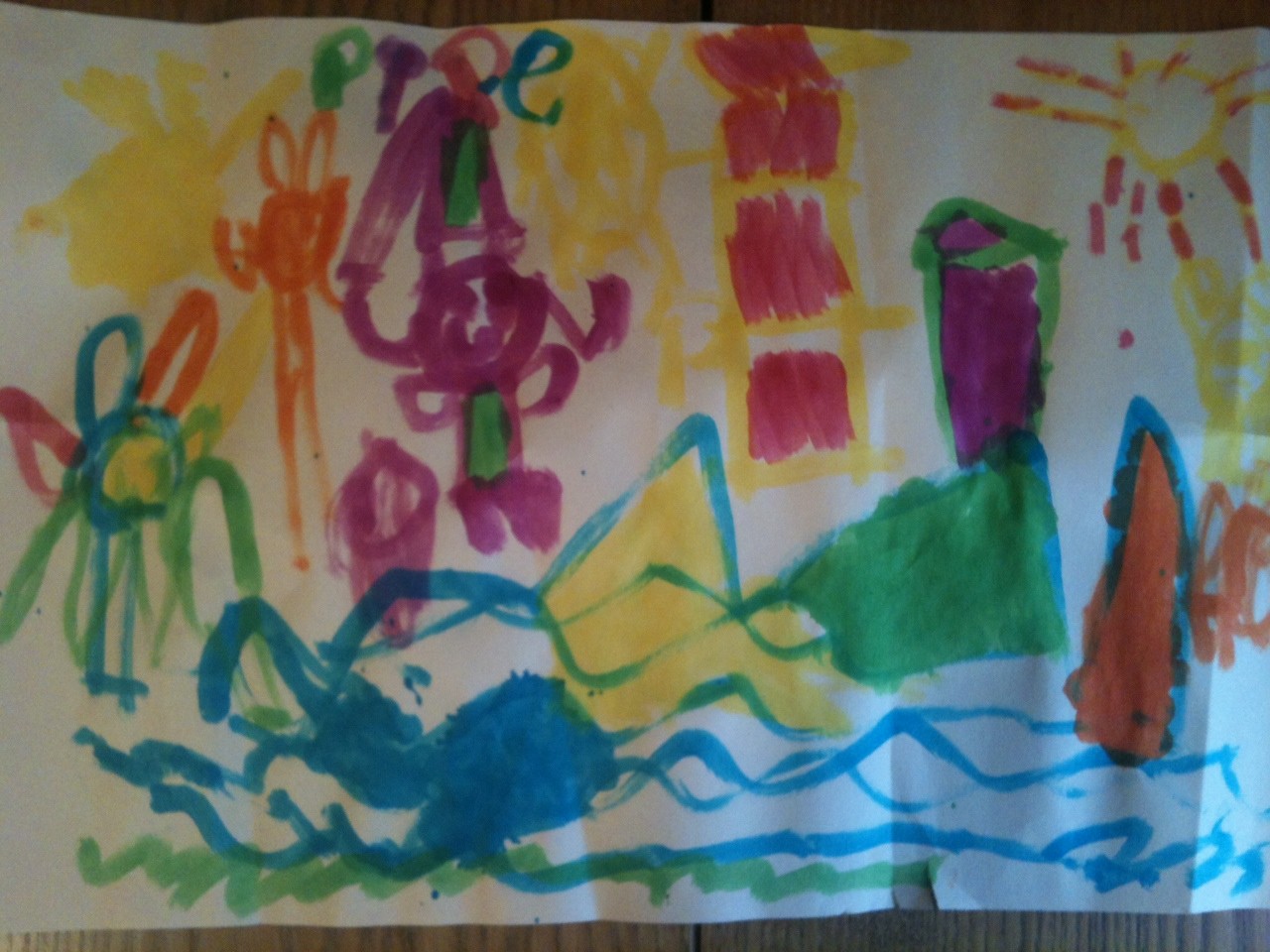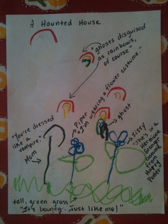 This ones probably my favorite. This is Piper, Sissy, and me dancing at the beach. And there is a mermaid swimming below us. She’s enjoying the shine from the three suns, too. You can never have enough sunshine. That pink and yellow stacked thing is a bento box. We like to take our sushi with us wherever we go.