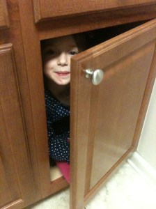 I was wrong. The best part of the new house is the post box between Sissy and Piper’s room. That’s right. There is a hole for the passage of secret messages and such. It was a cable box, but we don’t have any of that fancy stuff so Daddy took out the wiring and left the hole. He left in one screw, too, so you could cover the hole and then slide it to the side when you have an urgent errand, like passing a pen through the wall rather than walking the three feet around the door. The post box has been put to good use. Piper likes to do this through the hole: