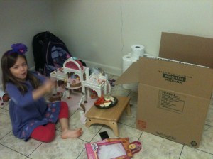 You can also throw things through the box at your Sissy, even if she doesn’t want you to. The games and fun are endless. We haven’t even unpacked the boxes of toys yet. Who needs them when you have a hole in your wall?