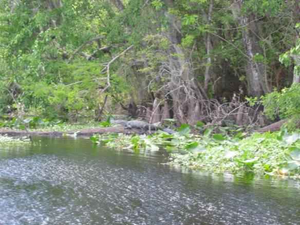Piper promised to listen to me, stay seated in the boat and at all times wear her lifejacket. We set off in the boat down the cannel by our house. Within 50 feet I spotted an alligator on a log. Thinking this would interest Piper, we motored over to take a picture.