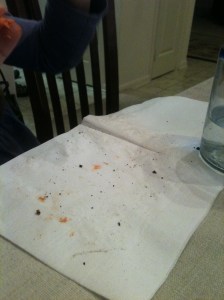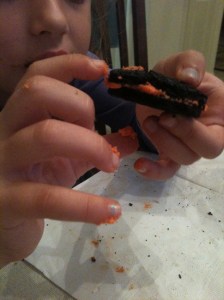 I know, right? Piper is a fiend with a Halloween Oreo. Who could resist their five Boo-rific shapes? Most people fall into the eat them whole vs. deconstruction category. Piper has developed her own Oreo eating method. I call it the autopsy.