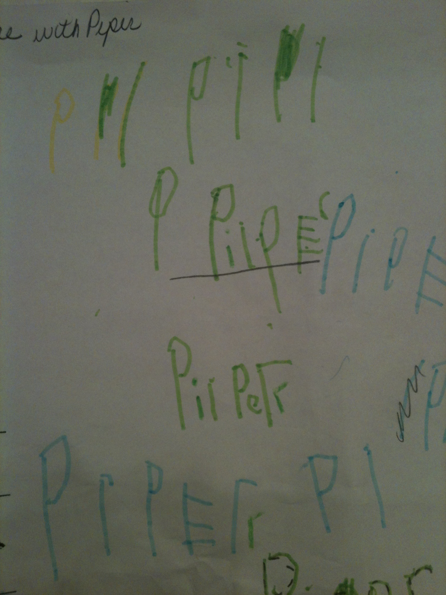 Piper mostly hates preschool.  Not the playground and the crayon thing but the academic thing.  If you have a preschooler, you may already know that they are doing long division by the end of the first week.  It’s insane.  Most of Piper’s classmates have been skilled and drilled since birth.  Half of them can already read. Piper can barely write her name.  It’s not that she doesn’t have the ability or that she isn’t bright, it’s that we haven’t really put our energy into her four-year-old academics.  She’s been busy making mud pies and memorizing Lady Gaga lyrics. Her father has taught her an array of armpit noise pitches.  We’re very proud. Every day her teacher sends home a note asking me to work with Piper on her name.  I haven’t paid much attention, but I’m pretty sure the note goes like this “Dear Lazy Mom Who Doesn’t Pay Enough Attention to Piper, Please take a few precious moments out of your busy day and work with this poor child on writing her name so that the other kids stop making fun of her on the playground. Thank you.”  I know that tone.  I’m a teacher, too. So, we work on the name thing.  We sit at the kitchen table with brightly colored paper and markers that smell of various fruit flavors.  And she does write a name.  It’s just not her name.  It goes like this: