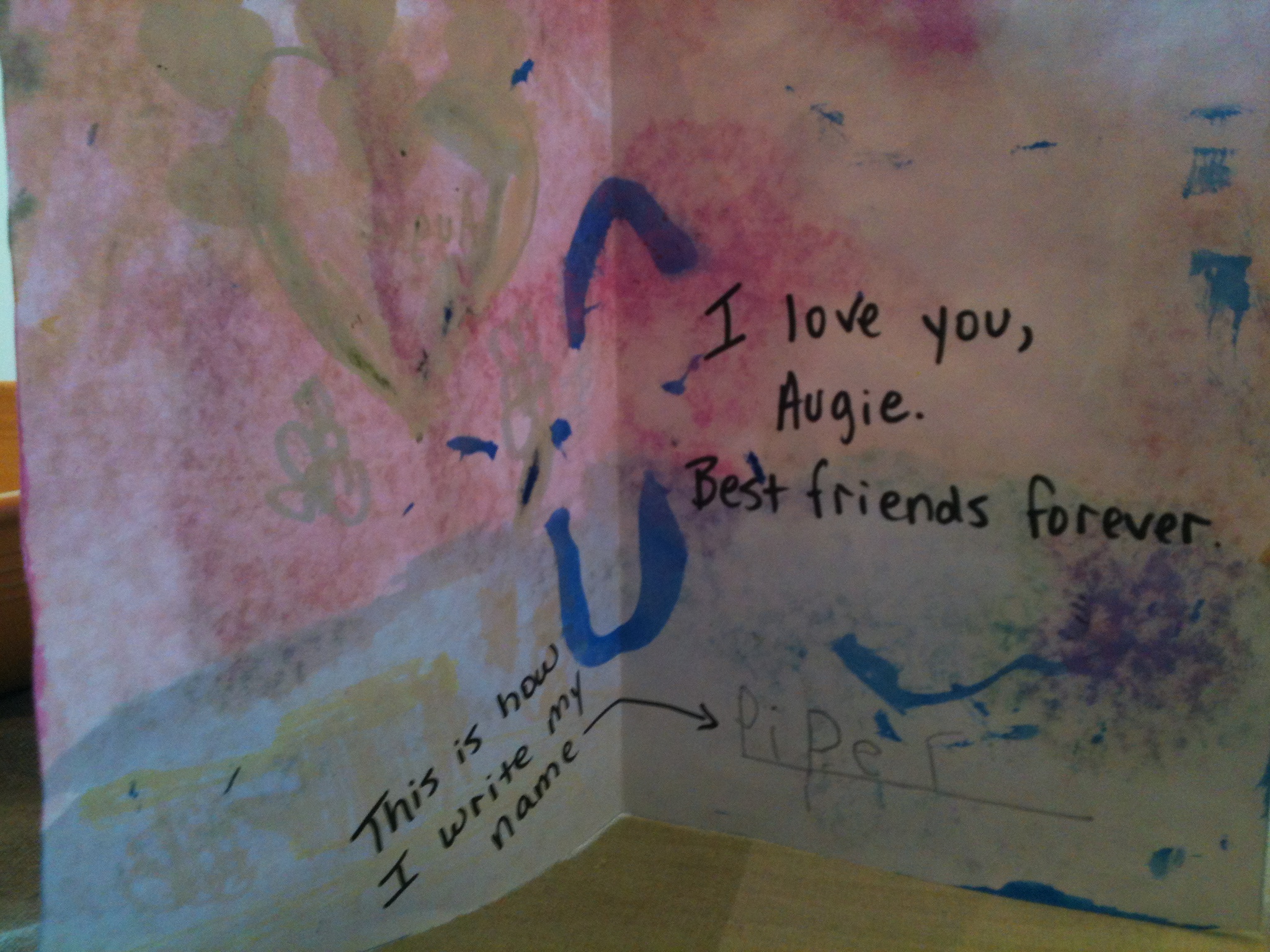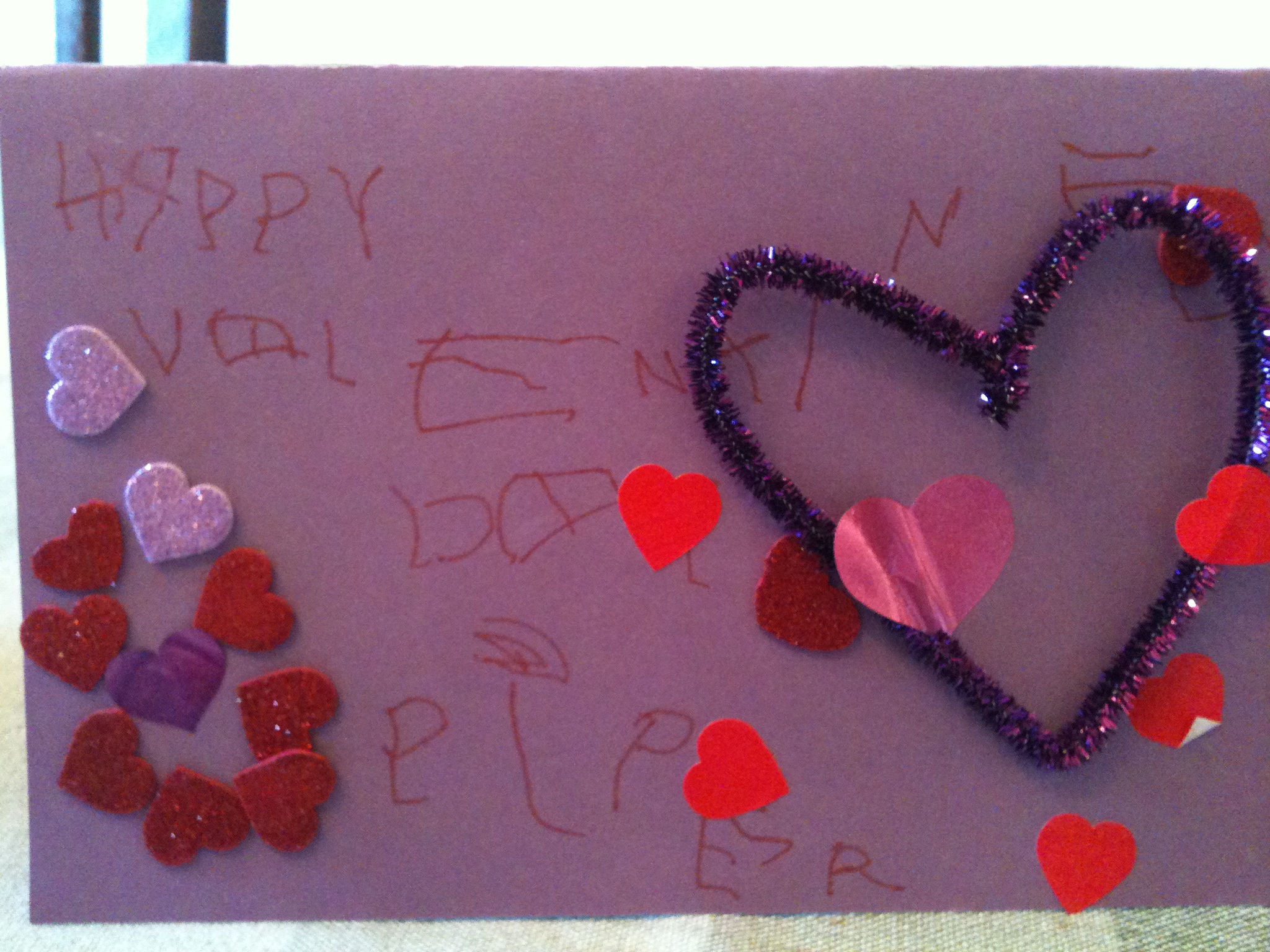 As a four-year-old in love, you have to rely on Skype, video messages, and the postal service to keep the flame alive. So, you work hard to express yourself to your valentine with the only tools you have: markers, glitter, heart stickers, and foam beads. Here is what Augie sent Piper this week: