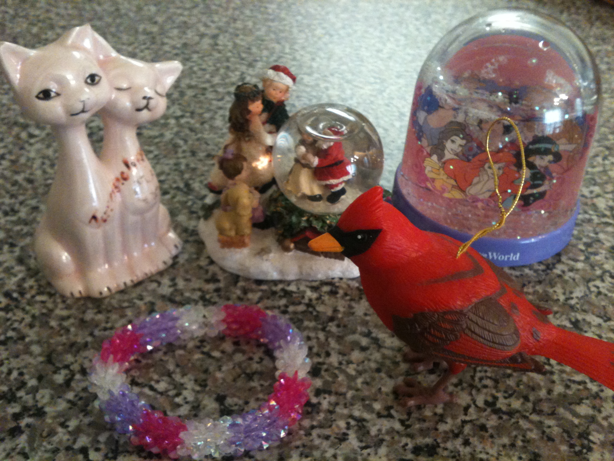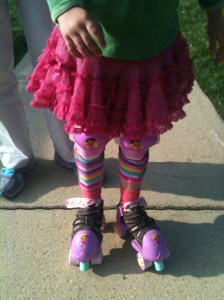 I know you have your eye on the holiday snow globe, but that’s for me. Isn’t it gorgeous? Santa is dancing with Mrs. Claus while that charming little family looks on. I’m already looking forward to Christmas. The plastic red bird ornament is for Piper’s dad. She says he’ll hang it on our tree this year. The cool cat statue have sustained some minor ear damage but they’re good as new. Meow. Who could resist a Disney globe with all those princesses? Not Sissy. And the bracelet? Well, Piper even got a little something for herself. A girl deserves a treat after all that haggling. But the real find? The super-duper-coolest-yard-sale-find ever? Roller skates.