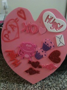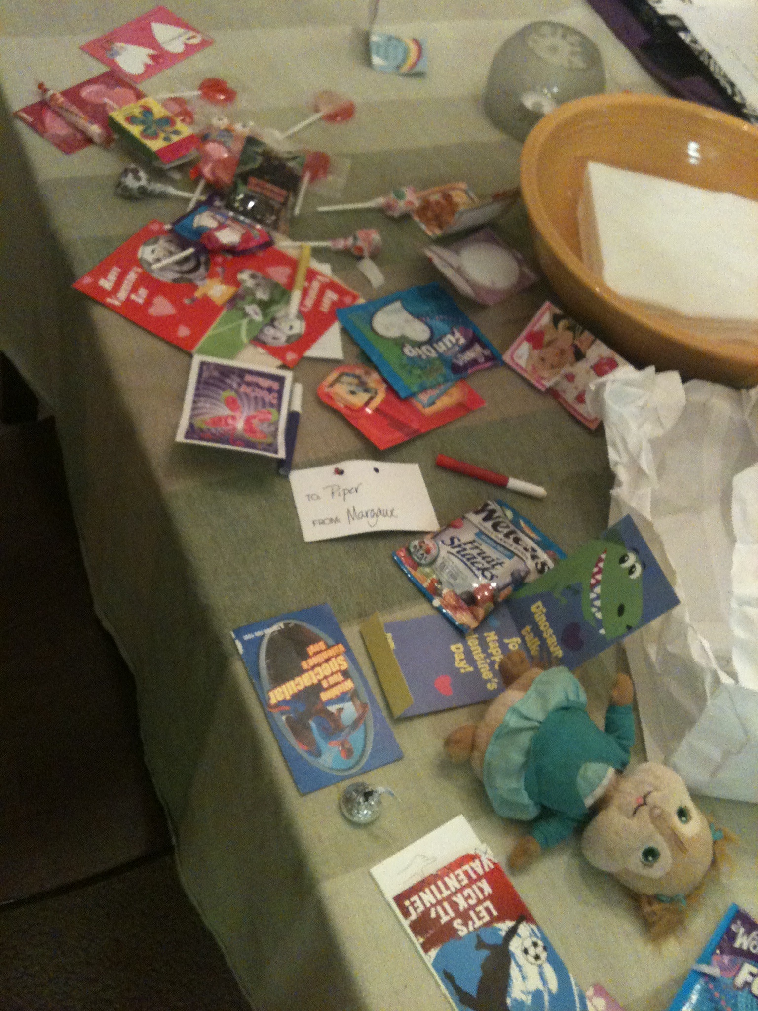 Swoon again. That Augie is sweeter than candy. That’s a lot of glitter hearts and you and I know clearly what that means. Nothing says I love you like a purple pipe clean molded into a heart. And any man who understands the importance of dotting your “i” as a statement is a good man in my book. Piper went a bit more of the clichéd route and relied on jewelry to express her feelings: