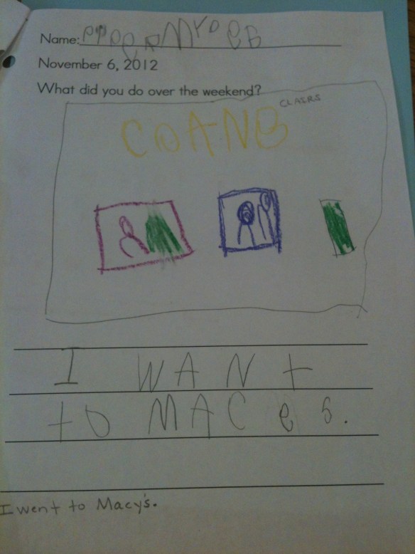 Now I know your kindergartener wrote her first novel last year, but Piper isn’t your kindergartner. Piper wrote about shopping. “I went to Macy’s.” Which is true, in her defense. Specifically, I took her to Claire’s. In the picture she drew headbands with sparkly bows and huge flowers. Those were her big purchase. She’s worn one of those headbands every day since. She loves a sparkly headband. She loves a sparkly anything. I praised her sentence, of course. I went ga ga over the thing. Piper glowed. Then she announced “Tomorrow I’m writing about my news boots!” Which are also pretty fabulous. Just like Piper.